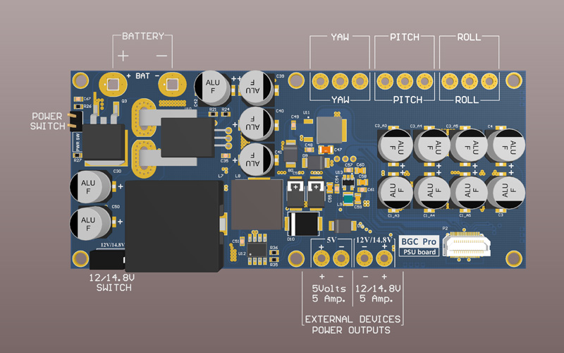 High-power motor drivers with current capabilities up to 13A per motor, that provides a capability to build a gimbal for virtually any camera system presented in the market (5…50 kg weight)- Integrated 5V DC regulated power supply